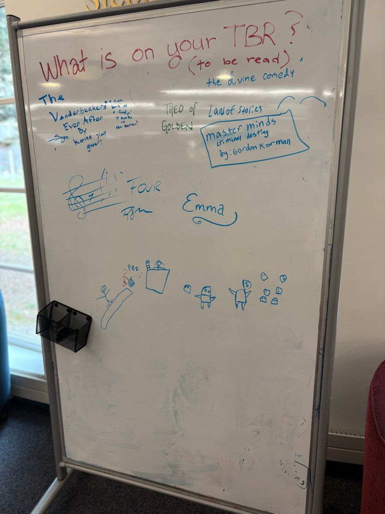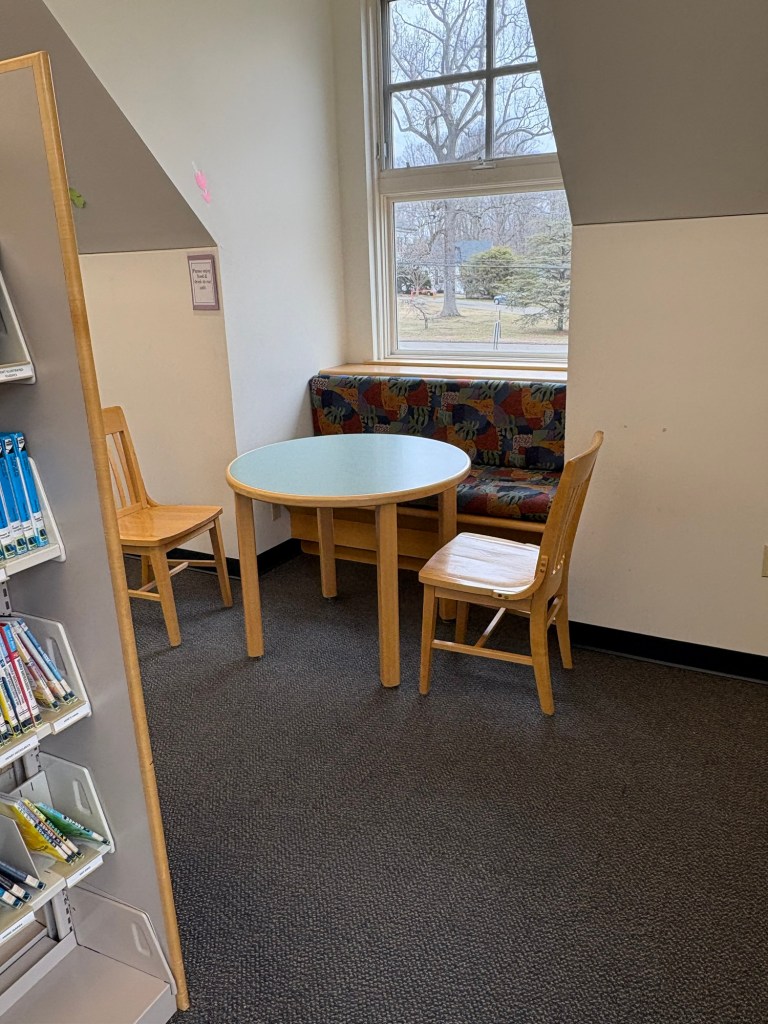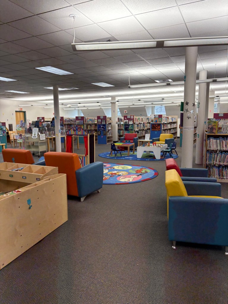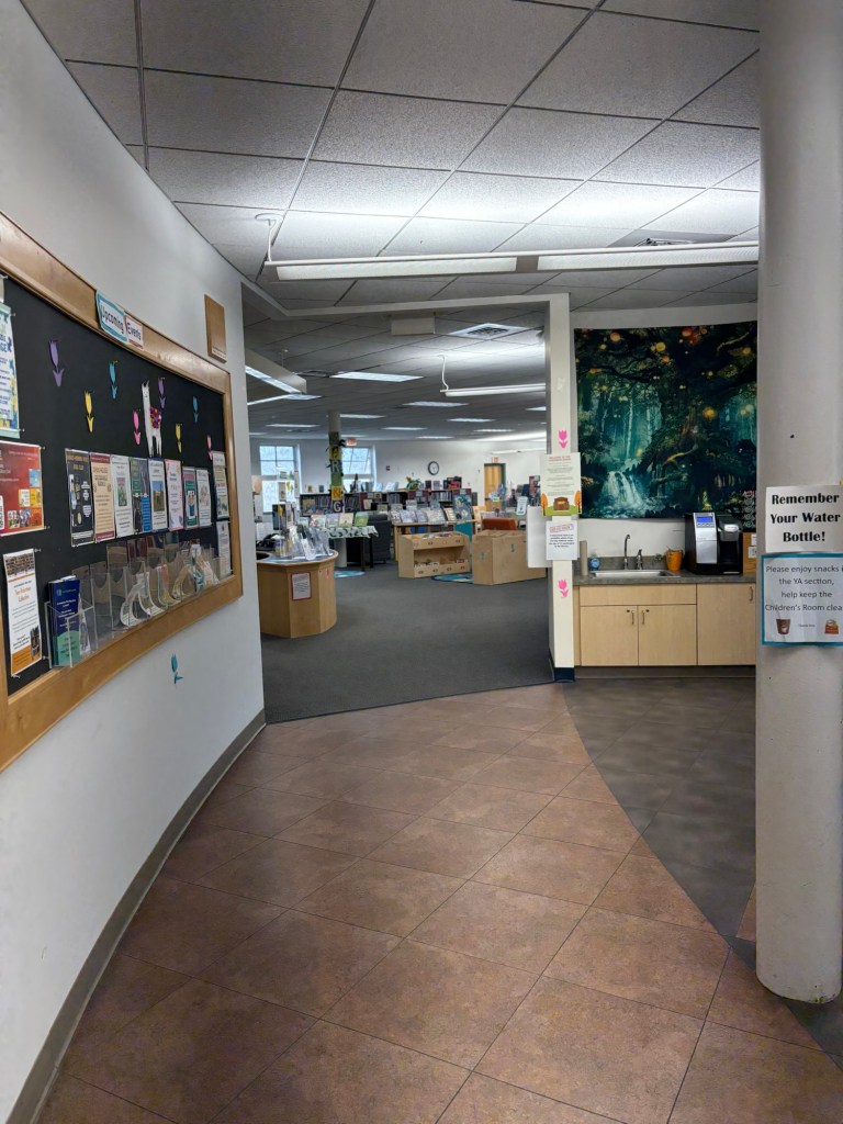 The Children’s Department is upstairs. There was a small space before you entered where the upcoming programs were displayed. This area boasts a coffee machine! You, and your coffee, are encouraged to sit and pause, breathe, or maybe even think for a moment.