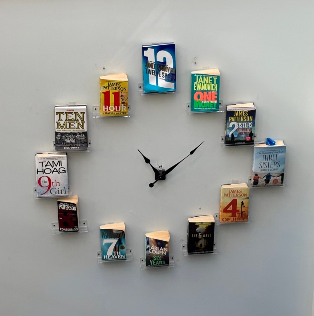 Surprisingly, I didn’t see any signage admonishing the use of footwear. I guess that isn’t a problem in every library. I did, however, manage to find a Pinterest worthy working book/clock display.