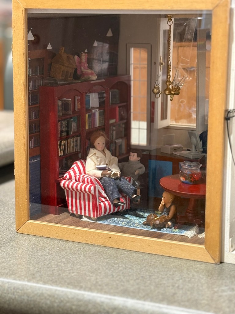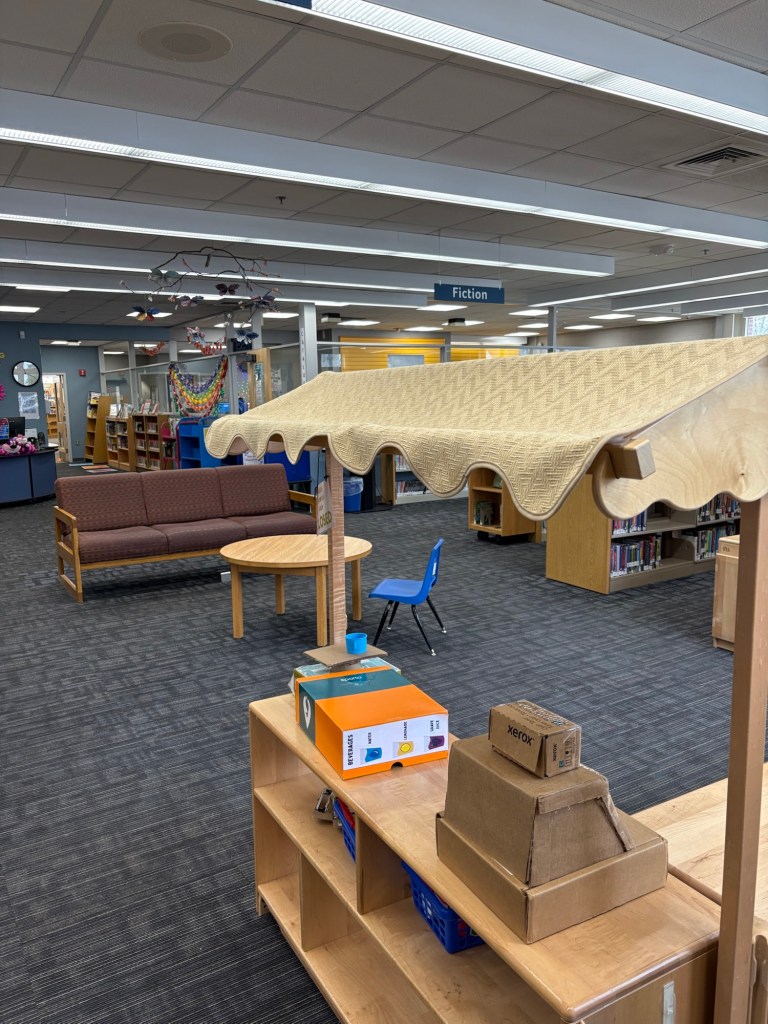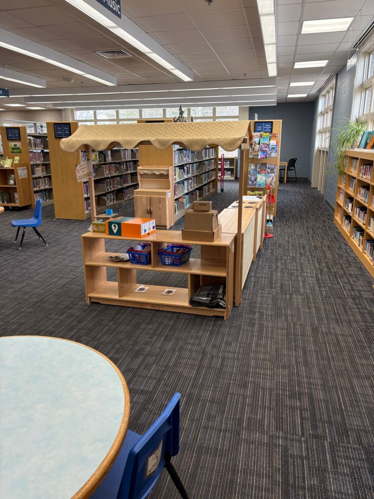 Right outside of this is the children’s department. This large area is well organized. There are books, a train set, and a kitchen set. There’s even a bathroom!