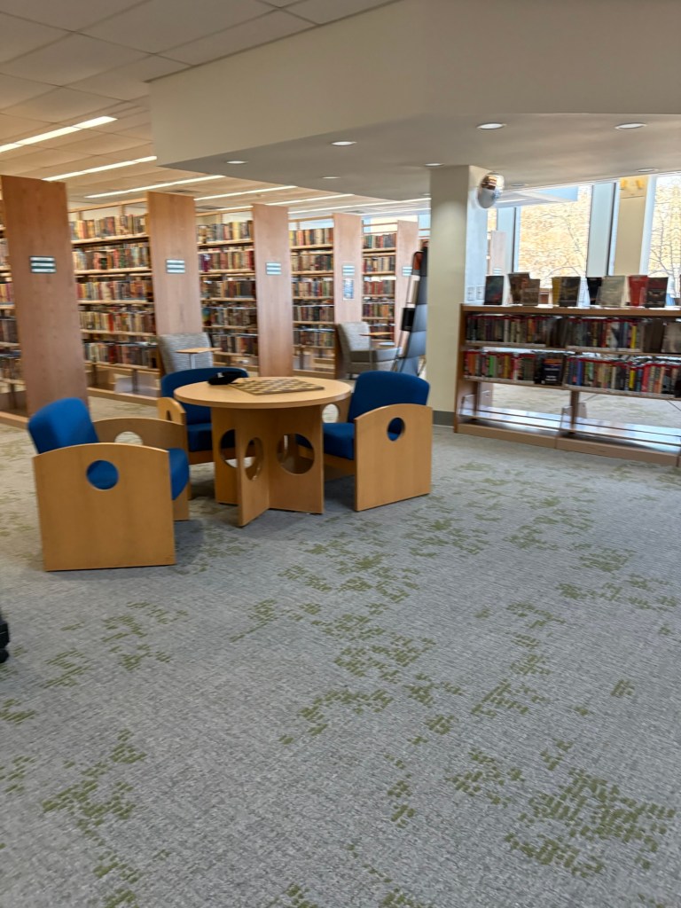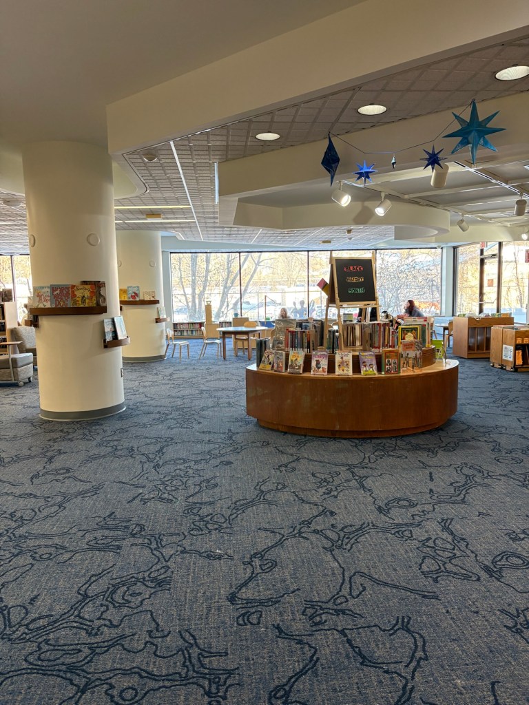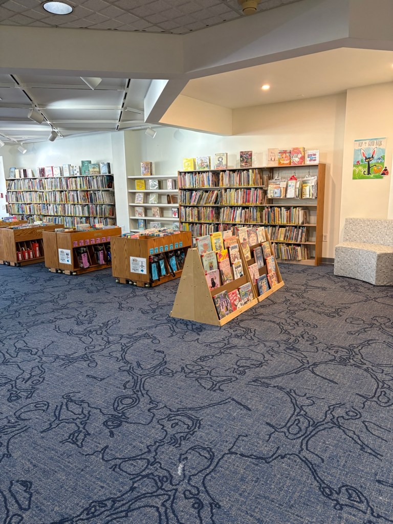 The children’s department is downstairs. It upgraded to new carpeting a few years ago and fun places to sit.